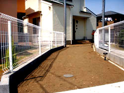 海岸に近いお宅だったので、南国風に仕上げました。 枕木を玄関まで敷きつめ周りには白い砂利をまき、 植木はドラセナとフェニックスを植えました。