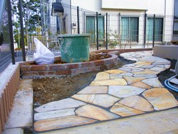 アプローチとガーデニングの依頼を頂きました。 通路には乱形石を張りレンガで花壇を作ってみました。 シンボルツリー(オリーブ)を植えて乱形石の通路のまわりにはピンクの砂利を引きました。