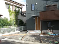 駐車場のスリットとデッキの下に白玉砂利を敷きました。