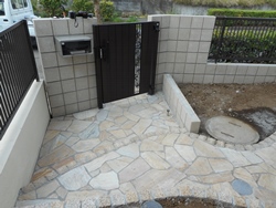 門扉にはジオーナ門扉を使用してアプローチに乱形石を張りました。