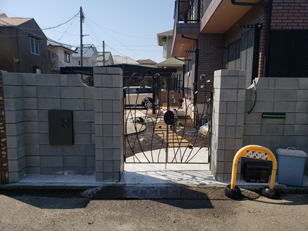 アプローチ部分は天縁石の白乱形石を張り詰め両脇を植栽スペースにしました門柱は凹凸をつけてジョリパットで仕上げアイアンの門扉を取り付けました。