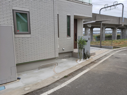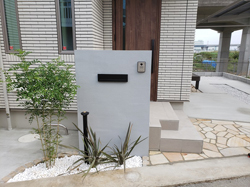 外構工事の依頼を頂きました。 門柱はジョリパットで仕上げシンボルツリーにシマトネリコとニューサイランを植えました。 アプローチには乱形石を張り駐車スペースにカーポート1台分を設置しました。