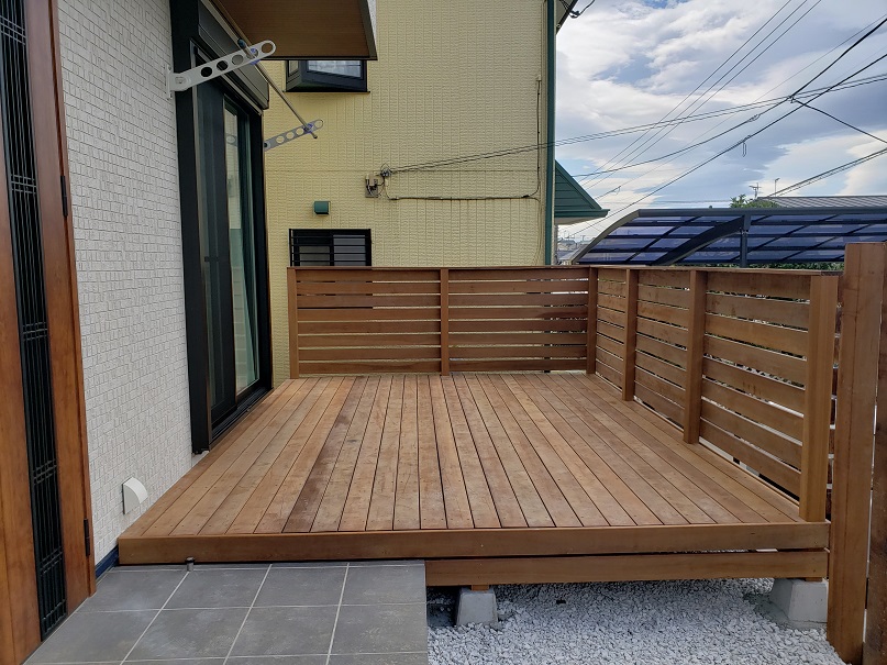 ウリンの木材で統一したので高級感が出る外構工事に仕上がりました。