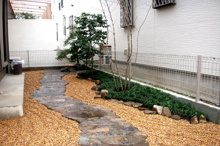 和風庭園のご依頼を受けたので、通路を延段で作り、ワンポイントでつくばいを設置してみました。