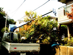 | ③移植する木が大きかったので、ユニック車を利用して作業している所です。 | ④2本の大きな木を移植して完成です。 |